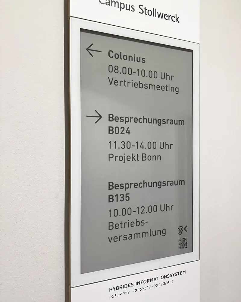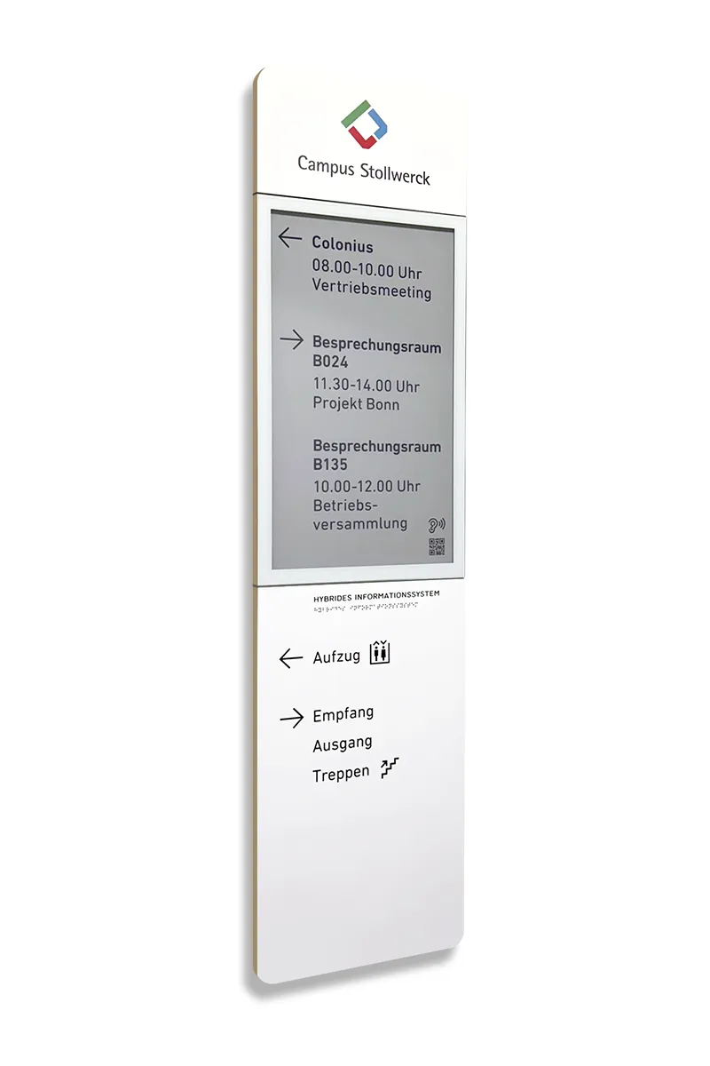 Klassische Schilder sind starr, reine Displays brauchen Dauerstrom und sind oft nicht barrierefrei. designage® hybrid mit E-Paper Display macht es anders — es verbindet das Beste aus allen Welten: