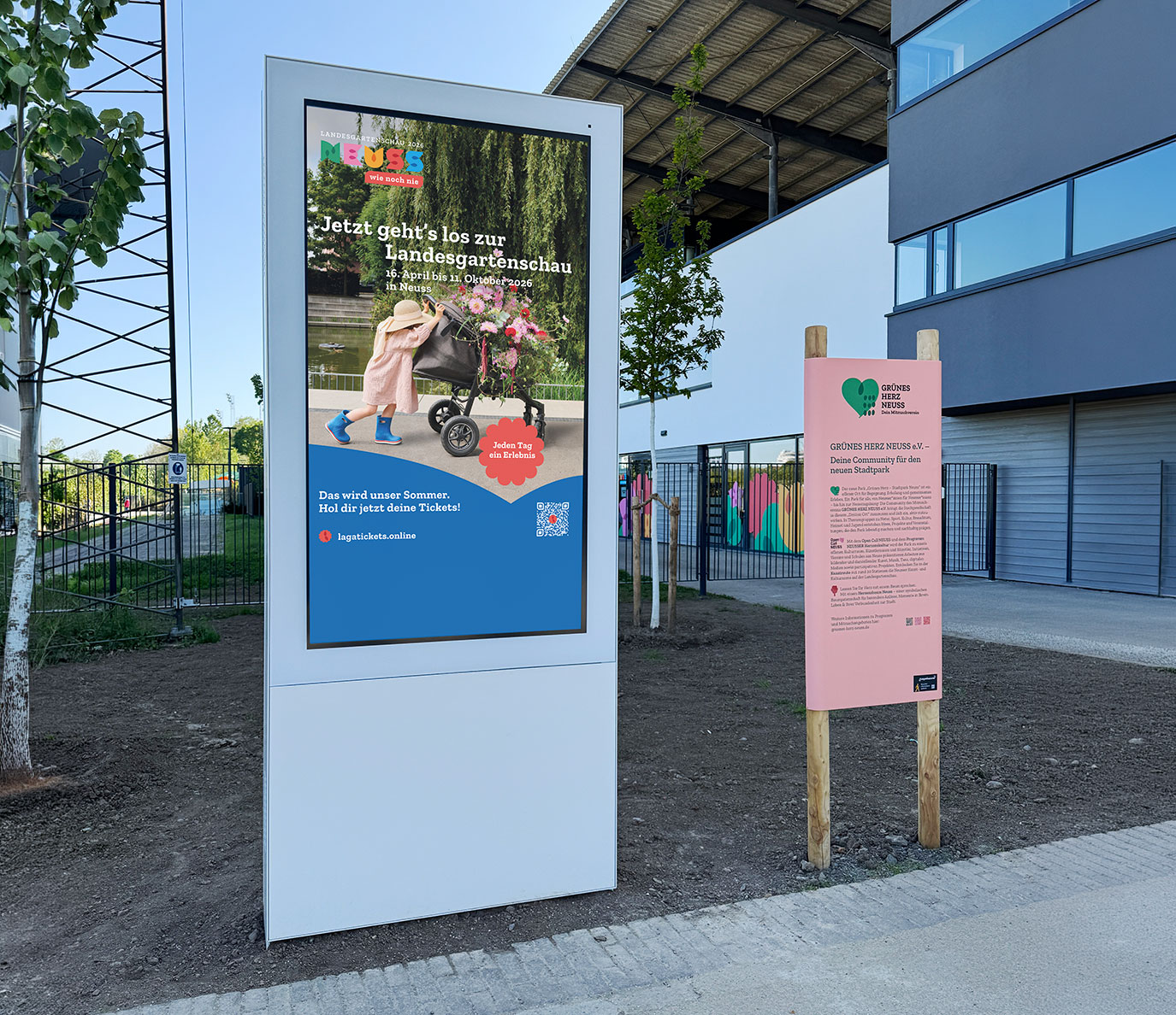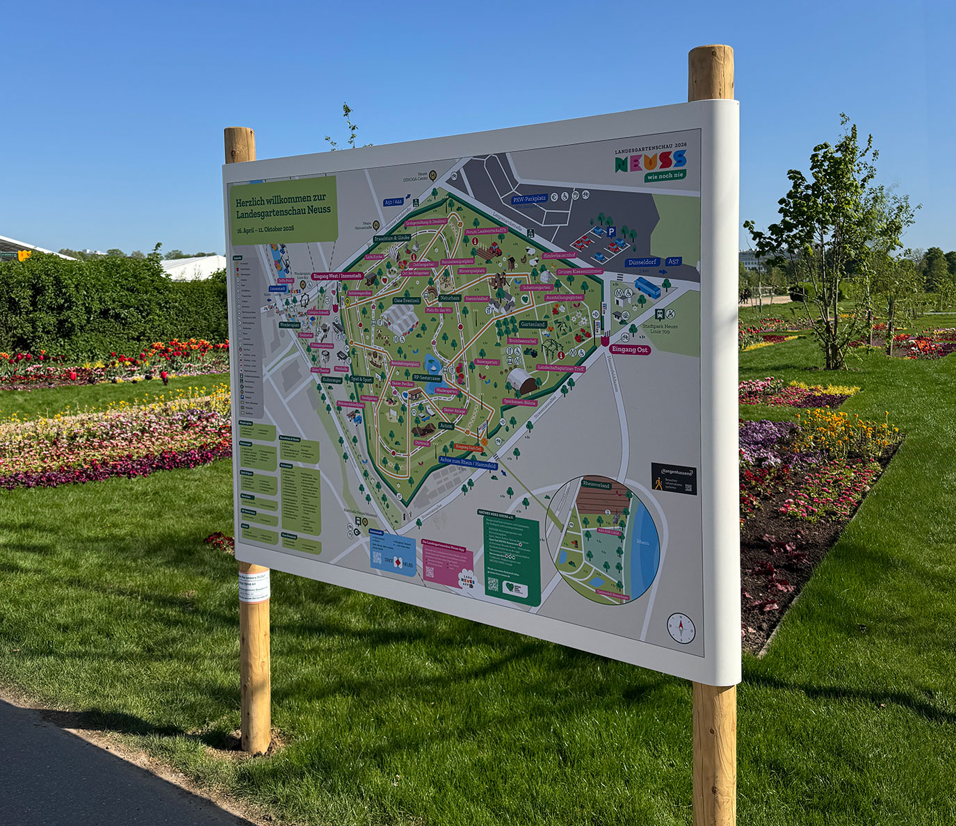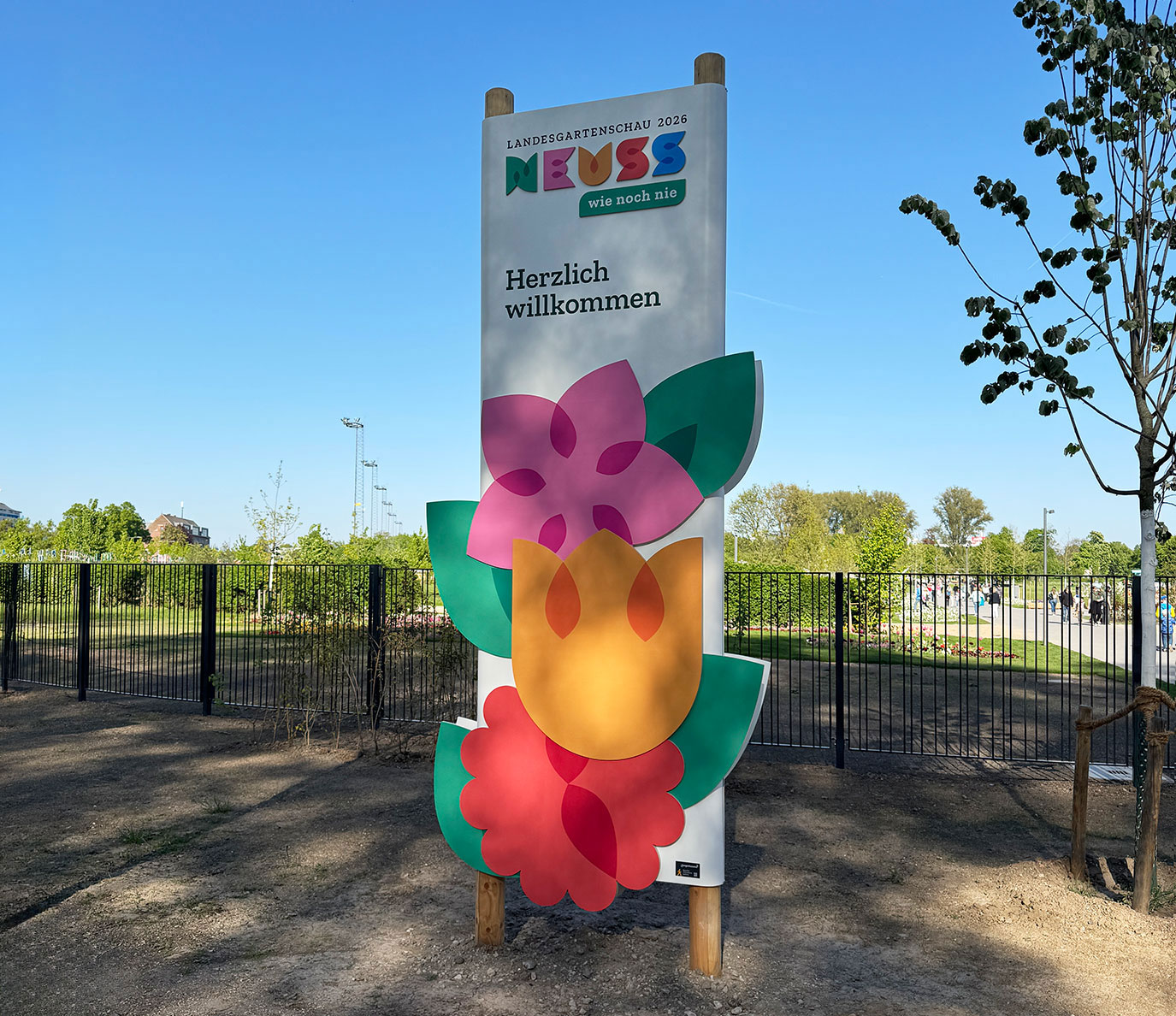 Für uns ist dieses Projekt mehr als ein Referenzobjekt. Es zeigt, was möglich ist, wenn Konzept, Design und Umsetzung aus einer Hand kommen – und wenn der Anspruch besteht, nicht nur zu liefern, sondern Substanz zu schaffen. Das Ergebnis ist ein Leitsystem, das Besucher sicher führt, Informationen klar vermittelt und sich nahtlos in das Gesamtbild der Landesgartenschau in Neuss einfügt.
