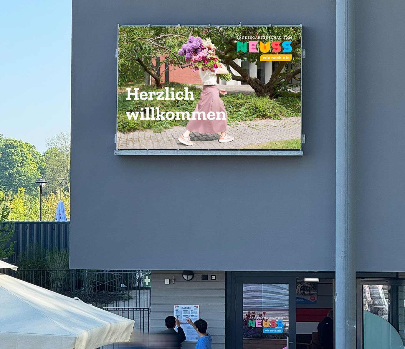 Innerhalb von nur vier Monaten entstand ein vollständig vernetztes Besucherleitsystem mit über 90 präzise geplanten und im Gelände verorteten Elementen. Ausgangspunkt war das bestehende Corporate Design der Landesgartenschau 2026 Neuss, auf dessen Basis unsere Designer mehrere eigenständige Gestaltungskonzepte entwickelt haben. Eines dieser Konzepte wurde gemeinsam weitergeschärft und schließlich konsequent in die Umsetzung geführt.