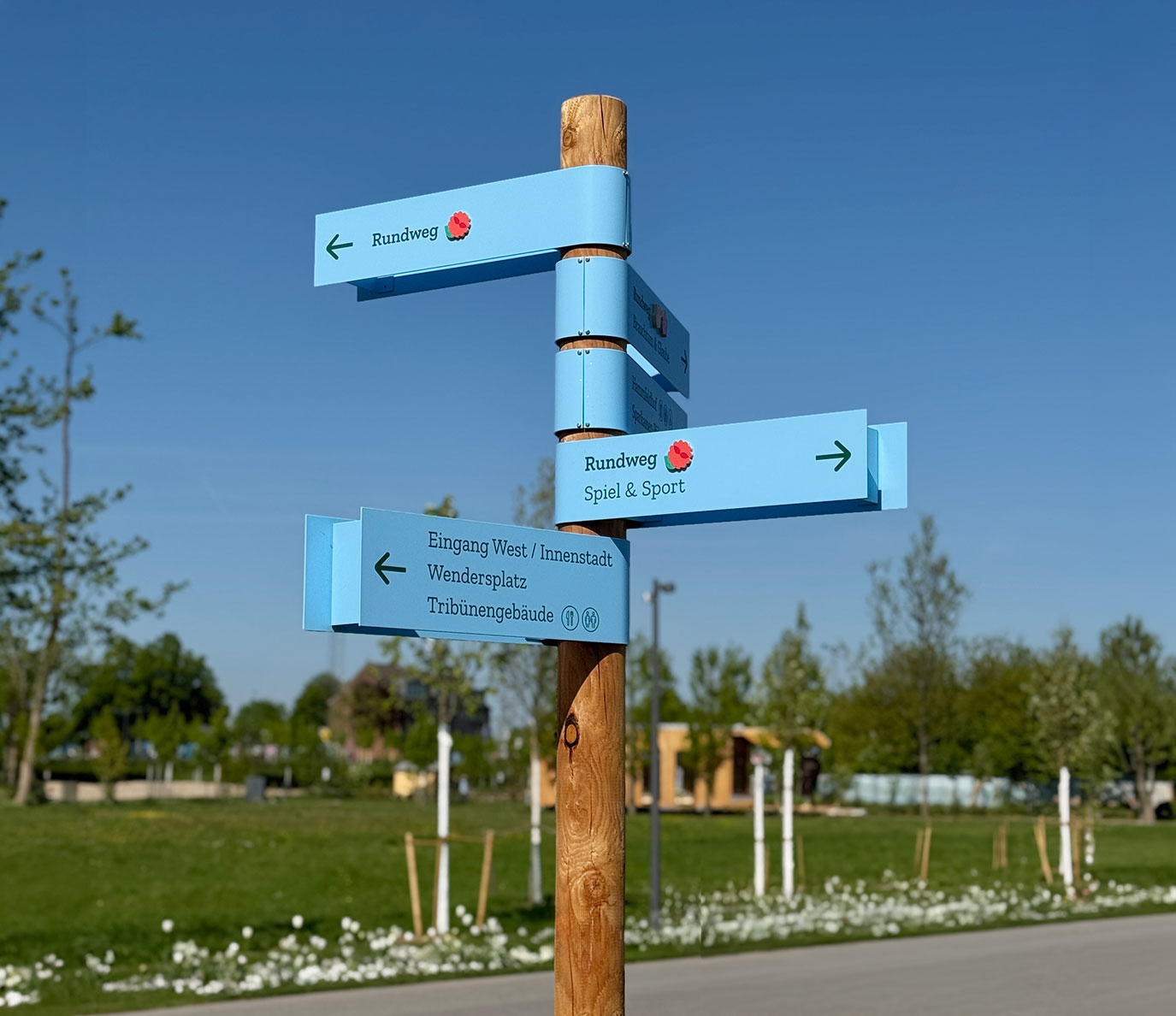 Die rund drei Meter hohen Wegweiser bilden das zentrale Navigationssystem auf dem Gelände. Mit klaren Richtungsangaben zu Themenbereichen wie Naturhain, Spiel-und Sportflächen oder Veranstaltungsorten sorgen sie für eine intuitive Wegeführung auch bei hohem Besucheraufkommen. Unterschiedliche Zielrichtungen und Rundwege sind logisch gegliedert und visuell eindeutig erfassbar. Ergänzt werden die Wegweiser durch niedrigere Wegkennzeichnungen entlang der Routen. Sie stabilisieren die Orientierung auf den Wegen selbst und sorgen dafür, dass Besucher jederzeit im Fluss bleiben, ohne aktiv suchen zu müssen.