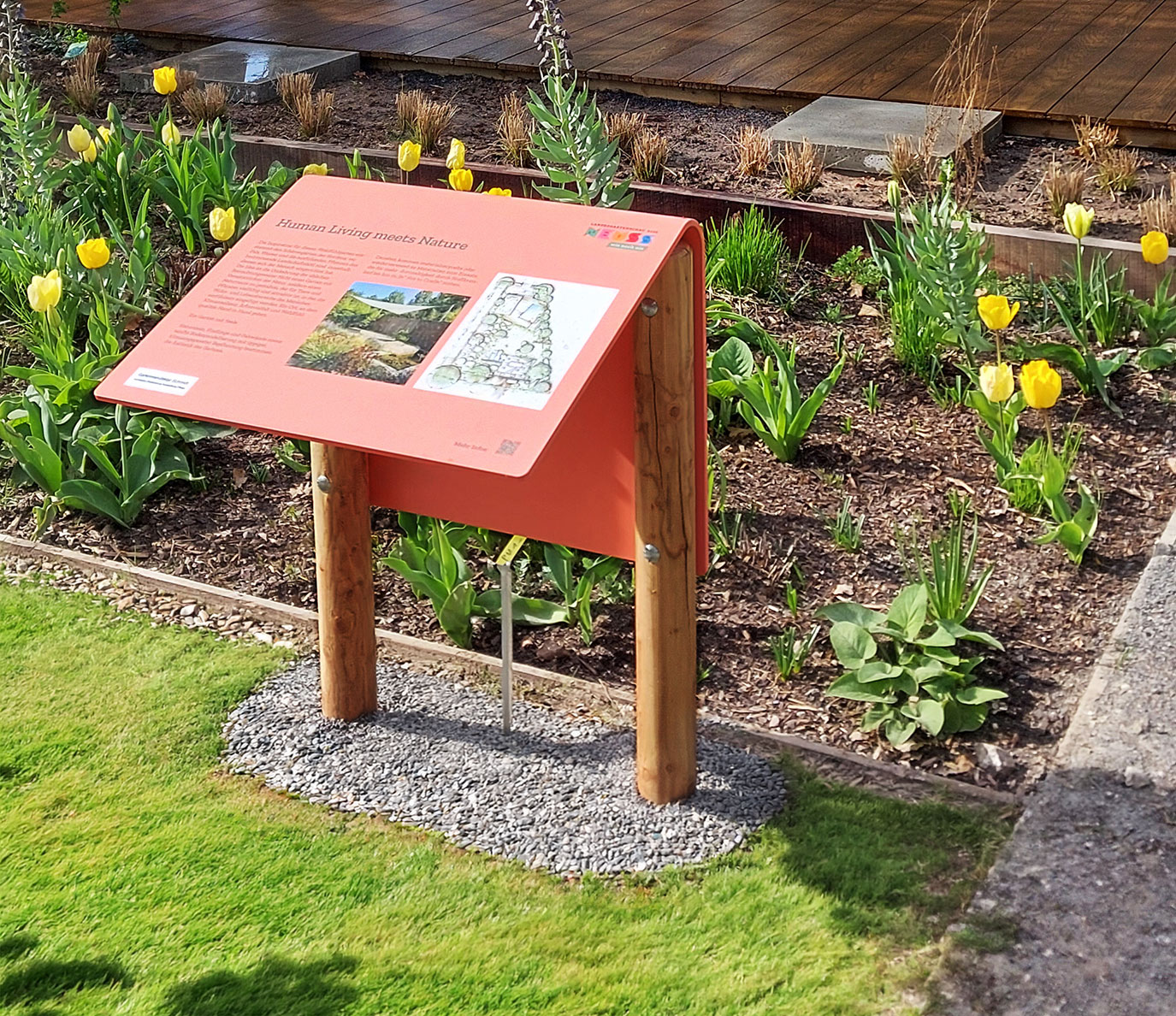 Nicht nur die Gestaltung, auch die Konstruktion folgt einem klaren Prinzip: so ressourcenschonend und gezielt wie möglich. Zum Einsatz kommen Holzpfähle aus Lärche sowie Grafiken und Schilder aus Resysta, einem nachhaltigen, faserverstärkten Material auf Basis von Reishülsen, das in Optik und Haptik täuschend echt an Holz erinnert und zugleich wetterfest, langlebig sowie zu 100% recycelbar ist. Ergänzt wird das System durch recyceltes Aluminium und PVC-freie Beschriftungsfolien.